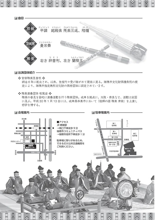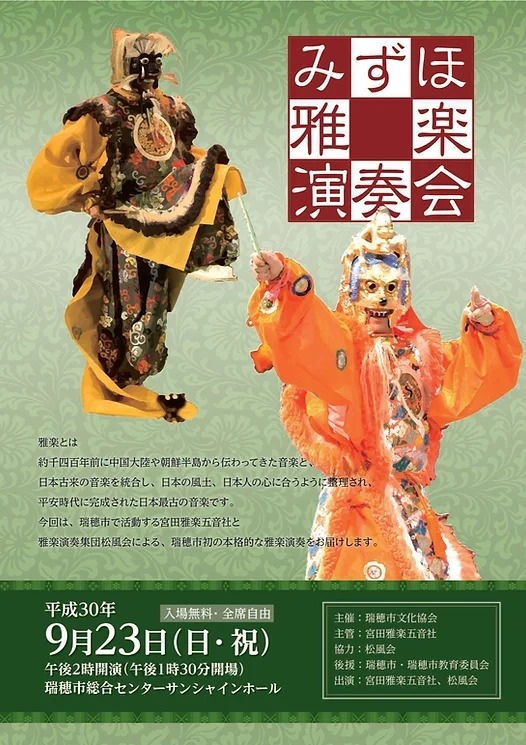 過去の活動 <みずほ雅楽演奏会>公演 2024年11月20日 by 雅楽松風会(代表:松久貴郎) 2018年9月23日 <みずほ雅楽演奏会> 公演(瑞穂市文化事業)を開催いたしました。 FacebookXHatena 雅楽松風会(代表:松久貴郎) 雅楽松風会は岐阜県各務原市に拠点を置く、正統派雅楽の演奏団を統括している会です。 結婚式やイベント等での現地出張による雅楽演奏を承っております。日時・ご予算等お気軽にご相談ください。